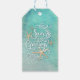 Eine tropische Drehung auf "Season's Greetings" mit den Worten "Seas AND Greetings" mit einem tropischen oder Strand-Look und fühlen Sie Ihre Weihnachtsgeschenke. Die moderne, elegante Schriftzeichen-Typografie in Weiß und umgeben von Seestern wirklich Pop vor einem ruhigen aquatischen Aquarell-Hintergrund auf der Vorderseite. Die Rückseite TO/From (die bearbeitet/gelöscht werden kann) hat einen leicht aquamarinen und weiß gestreiften Hintergrund, der mit aquamarinen und sandigen braunen Punkten und Sternenakzenten übersät ist. Personalisieren Sie nach Wunsch oder kontaktieren Sie den Designer, wenn Sie dieses Design für ein anderes Produkt wünschen.