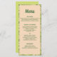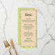 Ein Blumenmenü mit einer tropischen Pflanze, in der Mitte errötet (oder apricot) und im Hintergrund ein Zitronengrün mit einem Motiv aus tropischen Blättern. Alle Details können an Ihre eigenen Hochzeitsnahrungsmittel angepasst werden.