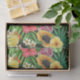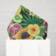 Tropisches Mischobst, Blume und Blätter auf schwar Seidenpapier