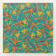 Nahtloses tropisches Muster mit stilisierten roten und gelben gestreiften Blättern und gelben Beerenclustern vor einem lebendigen Türkishintergrund.
