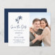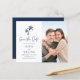 Diese elegante marineblaue, tropische Strandhochzeit BUDGET Save the Date verfügt über zwei Palmen über dem Text, eine stilvolle Handschrift für die "Save the Date" Ankündigung und ein Foto des glücklichen Paares.