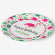 Tropisch rosa Flamingo Personalisierte Geburtstagspapier-Teller. Herrliche personalisierte flamingo Thema Geburtstagsparty Vorräte. Hübsches Flamingo-Thema grün und rosa Muster. www.SamAnnDesigns.com