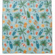 Helle tropische Muster-Duschvorhang mit Palmen, Surfboards, Zitrussscheiben, Flip-Flops und fruchtigen Getränken in einem unterhaltsamen sommerinspirierten Stil. Ideal für Strandliebhaber, Surfer, Urlaubsfans und alle, die bunte tropische Ästhetik lieben.
