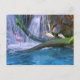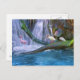 Dieses Bild eines tropischen Wasserfalls enthält drei Vögel: ein rosa Flamingo und zwei weiße Ibiss. Es ist eine schöne Postkarte.