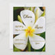 Eine Ehe ist der Beginn "neuer Anfänge". Die Plumeria, auch Frangipani genannt, ist das Hawaiianische Symbol für "Positivität" und "Neuanfang". Eine einmalige Hochzeitseinladung mit einem nahen Foto einer Blume der Plumeria mit tropischen Blätter und Knospen dahinter. In Hawaii wird diese Blume aufgrund ihrer Form und ihres süßen Duftes zur Herstellung von Lei-Halsketten verwendet.