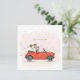 Uitnodigingskaart bruiloft met unieke illustratie van bruidspaar in een rode mini cabrio in een mediterrane sfeer