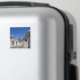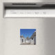 Souvenir Foto Magnet mit traditionellen weißen Gipshütten mit Steinplatten in konischen Dächern in einer kleinen Straße in der Gemeinde Alberobello, Itria Tal in Puglia, Italien.