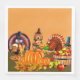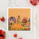 Niedliche Erntedank Szene mit ein paar Puten und einem Bären mit Pilgrimhüten. Ein Truthahn hat ein großes Stück Bier und ein anderer ein Kuchen. Vor dem Haus gibt es Kürbis, Äpfel, Nüsse und goldene Blätter. Weitere verfügbare Matching-Elemente
