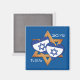 Stilvolle TU B'AV Jüdischer Tag der Liebe Magnet in TEKHELET BLUE mit CUSTOMIZABLE TEXT für Männer und Frauen, die feiern den jüdischen Valentinstag von Tu B'Av, auch bekannt als der jüdische Tag der Liebe. Das Design zeigt die "Star of David Fahne" Israels in Form von zwei Herzen, mit einem größeren Star of David im Hintergrund. Der hebräische Text (oben) wird 15. von Av. übersetzt. Jeder Text ist KUNDENBAR, sodass Sie durch Namen oder anderen Text ersetzen (oder löschen) können.
