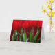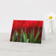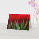 Karte mit hellroten Tulpen vor dunkelrotem Hintergrund