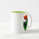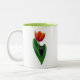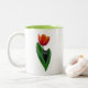In dieser Frühlingskatze versteckt sich eine schwarze Tasse in den Blätter einer orangefarbenen Tulpe-Blume.