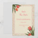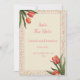 Stellen Sie sich eine Save the Date Karte mit einem schlichten, aber eleganten Design vor, das "Tulip Tango" heißt. An den Rändern der Karte hängen zarte, winzige Blume, die an Tulpen erinnern und eine Touch von Charme und Eleganz verleihen. Diese kleinen Blumendetails schaffen ein romantisches Ambiente, das Gefühle der Liebe und Feier hervorruft.