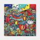 A.I. unterstützte den Druck einer surrealen Anordnung von Blume in verschiedenen Farben, die sich gegen eine wirbelnde psychedelische, gemusterte Kulisse auftun.