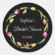 Bearbeitbare Tulips und Schmetterlinge Brautparty schwarz rund Aufkleber. Das Design zeichnet sich durch einen hübschen Kranz aus rosa, gelben und orangefarbenen Tulpen auf schwarzem Hintergrund aus. Ein rosafarbener und gelber Schmetterling rundum die Tulpen, der die fröhliche Ästhetik mit einer skurrilen Touch verstärkt! Nutzen Sie als Umschlag Aufkleber Ihre Bridal Dusche Einladungen und Blumenmotive laden ein! Personalisieren Sie den Text und ändern Sie den Stil und die Farbe des Schriftartes in Anzug. Setzen Sie den Text gegebenenfalls mit dem Entwurfstool um und entfernen Sie ihn.