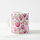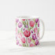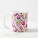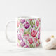 Diese klassische Tasse mit weißem Kaffee wird mit einem hübschen Tulpenprint gezeigt. Passen Sie diese Tasse an oder kaufen Sie, wie es ist. Lizenziertes Bild