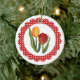 Dieses Tulips Ornament zeigt meine digitale Kunst Aquarellmalerei von Tulpen mit einem roten, gewebten Rahmen.
