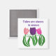 Rosa und lila Tulpen mit knusprigem grünem Blattwerk. Eine lustige Nachricht.. die Nachricht kann auf Wunsch geändert werden.