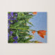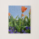 Dieses bezaubernde Blumenfoto zeigt eine Nahansicht eines Blumengartens mit leuchtend orangefarbenen Tulpen hinter einer Abdeckung von lila Stiefmütterchen (oder vielleicht Petunien - ich werde diese Beschreibung überprüfen und aktualisieren, wenn ich kann). Gelbe Tulpen sind auf der Rückseite sichtbar, und ein schöner blauer Frühlingshimmel ist überdeutlich sichtbar. Dieses Foto wurde im April 2024 auf dem Gelände des Taylorsville-Utah der Kirche Jesu Christi der Heiligen der Letzten Tage in seiner Zeit des offenen Hauses aufgenommen.