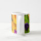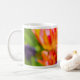 Farbenfrohe Tulpen auf einem Blumenbett. Fast alle Regenbogenfarben sind vorhanden. Helle und positive Blumenszene. Makrofotografie.