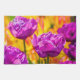 Farbenfrohe violette, lila, rosa Tulpen auf einem Blumenbett. Fast alle Regenbogenfarben sind vorhanden. Helle und positive Blumenszene. Makrofotografie.