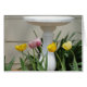 Naturblumenphotographie, der reizenden Tulpen durch einen Birdbath und ein Denken an Sie Ausdruck enthält diese Karte