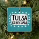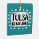 "Tulsa Is My Jam" ist ein lustiges Textdesign mit einer weißen Akzent-Form, umgeben von weißen, whimsikal strukturierten Punkten.