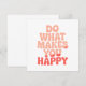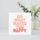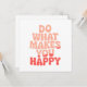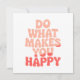 Mit dieser fröhlichen und aufregenden Grußkarte, die den inspirierend Satz "Do What Mays You Happy" in lebendiger, farbenfroher Schrift enthält, wird jemandes Tag gemildert. Ob Sie es einem Freund geben oder es als tägliche Erinnerung nutzen, um mit Freundlichkeit zu führen, dieses Design liefert eine Botschaft der Ermutigung, Freude und guten Gesinnung.