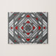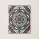 Eine konzentrische quadratische Mandala nimmt das Aussehen eines Tunnels an, der den Betrachter mit einer Kombination aus verworrenen Linien, Dreiecken und Kreisen in Grautönen, Rot und Weiß zeichne, um fast eine optische Täuschung zu erzeugen.