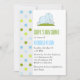 Babyduscheneinladung des stilvollen Paares erfolgt im Weiß, mit einem Band der grünen und blauen Polkapunkte, auf der links Seite und einem niedlichen blauen Elefanten, auf die Oberseite der Einladung. Personifizieren Sie den ganzen Text zum Anzug Ihr Ereignisbedarf.
