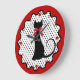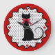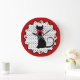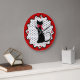 Niedliche Silhouette der schwarzen Katze über weißem und schwarzem Polkapunkthintergrund und gewellter Randrotgrenze. Größere rote Punkte stellen dar, dass Positionen von 12, 3, 6 und 9. kleineren roten Punkten die anderen Stunden an einem Tag anzeigen.