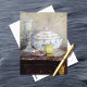 Eine Postkarte mit dem Gemälde Tureen und Apfel (1877) der französischen Impressionistin Berthe Morisot (1841-1895). Eine atemberaubende Stilleben-Postkarte, die einen lebendigen grünen Apfel neben einer klassischen blau-weißen Tureen und einem glänzenden Kristallglas zeigt.