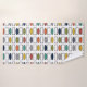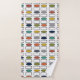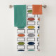 Dieses Handtuch-Set ist mit einem Badehandtuch ausgestattet, das Mitte des Jahrhunderts in Retrofarben wiederholt rechteckige und ovale Ovale aufweist, mit einem orangefarbenen Waschtuch und einem türkisfarbenen Handtuch.