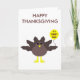 Diese lustige Erntedank-Karte zeigt einen lustigen Cartoon eines Truthühners mit großen schwarzen Augen, einem kleinen gelben Schnabel und Schwanz Federn, die aufhängen. Die Füße stehen in entgegengesetzter Richtung, wodurch der Truthahn unbeholfen aussieht. Der Truthahn hält einen gelben Ballon mit einer Meldung im Inneren, in der steht: "Es ist Zeit für den Truthahn". Das ist ein lustiges Erntedank Party Design. Auf der Vorderseite der Karte befindet sich ein individualisierbarer Gruß. Die Innenseite der Karte ist leer.