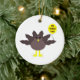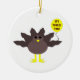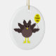 Dieses Ornament zeigt einen lustigen Cartoon eines Truthahns mit großen schwarzen Augen, einen kleinen gelben Schnabel und Schwanz Federn klebrig. Die Füße stehen in entgegengesetzter Richtung, wodurch der Truthahn unbeholfen aussieht. Der Truthahn hält einen gelben Ballon mit einer Meldung im Inneren, in der steht: "Es ist Zeit für den Truthahn". Das ist ein lustiges Erntedank Party Design.