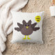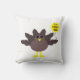 Dieses phantastische Kissen besticht durch einen lustigen Cartoon eines Truthühners mit großen schwarzen Augen, einen kleinen gelben Schnabel und Schwanz-Federn, die aufhängen. Die Füße stehen in entgegengesetzter Richtung, wodurch der Truthahn unbeholfen aussieht. Der Truthahn hält einen gelben Ballon mit einer Meldung im Inneren, in der steht: "Es ist Zeit für den Truthahn". Das ist ein lustiges Erntedank Party Design.