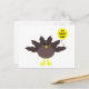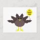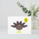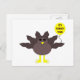 Diese lustige Erntedank-Postkarte zeigt einen lustigen Cartoon eines Truthahns mit großen schwarzen Augen, einem kleinen gelben Schnabel und Schwanz-Federn, die aufhängen. Die Füße stehen in entgegengesetzter Richtung, wodurch der Truthahn unbeholfen aussieht. Der Truthahn hält einen gelben Ballon mit einer Meldung im Inneren, in der steht: "Es ist Zeit für den Truthahn". Das ist ein lustiges Erntedank Party Design.