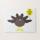 Dieses phantastische Rätsel enthält einen lustigen Cartoon eines Truthühners mit großen schwarzen Augen, einem kleinen gelben Schnabel und Schwanz Federn, die aufhängen. Die Füße stehen in entgegengesetzter Richtung, wodurch der Truthahn unbeholfen aussieht. Der Truthahn hält einen gelben Ballon mit einer Meldung im Inneren, in der steht: "Es ist Zeit für den Truthahn". Das ist ein lustiges Erntedank Party Design.