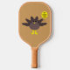 Dieses phantastische Pickleball Paddle ist mit einem lustigen Cartoon eines Truthahns mit großen schwarzen Augen, einem kleinen gelben Schnabel und Schwanz Federn, die aufhängen. Die Füße stehen in entgegengesetzter Richtung, wodurch der Truthahn unbeholfen aussieht. Der Truthahn hält einen gelben Ballon mit einer Meldung im Inneren, in der steht: "Es ist Zeit für den Truthahn". Das ist ein lustiges Erntedank Party Design.
