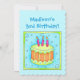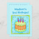 Feiern Sie die dritte Geburtstagsparty eines Mädchens mit dieser individuellen Einladung, die mit ihrem Namen und "3. Geburtstag" auf der Vorderseite personalisiert ist und alle Party-Informationen auf der Rückseite der Einladung. Diese Einladung schafft einen glücklichen Geburtstag mit niedlicher und weißer Kunst eines hellgrünen und orangefarbenen Geburtstagskuchens mit drei heißen rosa Kerzen. Eine weiche, grüne Grenze umgibt den Kuchen und den türkisblauen Hintergrund, der mit weißen Kreise gefüllt ist. Die Einladung hat einen türkisblauen Hintergrund auf der Vorder- und Rückseite. Die Geburtstagstorte ist auch auf der Rückseite mit den Party-Informationen. Diese originale Kunst stammt von Phyllis Dobbs. Vollständig anpassbar und kann für ein anderes Zeitalter für ein lustiges Party angepasst werden. Koordinieren Sie Briefmarke und andere Produkte, die mit denen übereinstimmen.