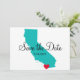 Maßgeschneiderte türkisfarbene kalifornische Kartenform mit Save the Date Design. Ändern Sie die Farbe des Staat, um die Farbe Ihrer Hochzeitsfarben anzupassen. Wenn Sie irgendwo heiraten, außer in der Gegend von San Diego, können Sie das rote Herzsymbol verschieben. Passen Sie die Farbe des Herzens auf Ihren bevorzugten Farbton in Rot oder einer anderen Farbe an. Die modernen und eleganten Kalligraphie-Schriftart-Stile sind individuell anpassbar. Der Hintergrund auf der Rückseite ist ein türkisfarbenes und aquamarines digitales Aquarellbild für Ihre Hochzeit an der Küste. Löschen Sie die Digitalgrafik und verwenden Sie eine feste Hintergrundfarbe, wenn Sie die Farbe des Staat ändern. Erstellen Sie Ihren eigenen kalifornischen Strand oder Hochzeit am Meer speichern Sie das Datum Design.
