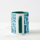 Eine stilvolle, weiße Kaffeemaschine mit grüner Lippe und Haltegriff und einem abstrakten türkisfarbenen, seegrünen, tiefblauen und weißen Tasse, aus einem Siebdruck von Judy Adamson.
