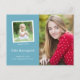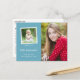 Die Ankündigung dieses Abschlusses ist klassisch, mit zwei Fotos und einem türkisblauen Hintergrund gestaltet. Auf der Vorderseite der Postkarte befindet sich ein großes vertikales Foto auf der rechten Seite und ein kleineres quadratisches Foto auf der links. Fügen Sie unter dem quadratischen Foto den Namen des Absolventen, das Schuljahr und die Schule hinzu. Auf der Rückseite der Postkarte können Sie eine längere persönliche Nachricht und Gruppendetails hinzufügen.