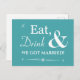 Laden Sie Freunde und Familie ein, um Ihnen zu helfen, Ihre kürzliche Ehe mit dieser trendigen Retro-Weiß auf türkisblau essen, Drink & Be Verheiratet! Entdecken Sie die Party Einladung Postcard!