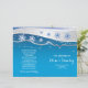 Eine schöne Winterfeier mit gefalteter Hochzeitsfeier und ein Party-Programm mit Reihen von wunderschönen weißen und blauen Schneeflocken, einer silbergrauen gewellten Linie und grauen Sternen auf türkisfarbenem Hintergrund. Auf der Rückseite sind blaue Schneeflocken und Aquabanken. Wenn Sie es in der Mitte falten, erhalten Sie ein Hochzeitsprogramm im Booklet-Stil für Ihre Weihnachtsfeier. Der Werttyp ist derjenige, den Sie wählen sollten, da er sich gut faltet.