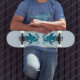 ein dekorativer Medientinten- und -Gouacheentwurf von zwei Stammes- Tätowierungshaifischen oder -Schwertwalen des Türkises auf einem Skateboard