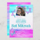 Farbenfrohe Bat Mitzvah Einladung mit türkisfarbenen, aqua, rosa und lila Glitzer Kunstwerken. Niedliches quadratisches Foto mit David-Kunstwerk auf farbenfroher Textur Hintergrund ist ein festlicher Look für Ihre Fledermausmitzvah-Feier. Die Beschriftung von Fotos kann in jede beliebige Wortwahl geändert werden. Laden Sie Ihr Foto einfach in den Foto-Rahmen hoch. Glitzer-Band gibt dieser Fledermaus Mitzvah Einladung ein Scrapbook Ästhetik.