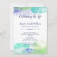 Einladung zur Gedenkfeier mit Wasserfarben in erbsengrün, lila und türkis. Fügen Sie Ihre Einladungsworte in dunklem lila hinzu.