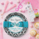 Diese personalisierten und romantischen 9"-Teller für eine Hochzeit eignen sich hervorragend zum Empfang, zum Brautparty oder zum Abendessen mit Probe. Diese 9" runden, schwarz-weißen Damast-Teller sind sicher ein unvergesslicher Treffpunkt für Ihre Gäste und sind eine weitere Möglichkeit, um während Ihrer Hochzeitsfeiern einen zusammenhängenden Look behalten. Der rund gestaltete Bereich dieser Teller hat ein türkisfarbenes Band und ein Bugbild, in der Mitte sind Herzensbilder miteinander verbunden. Über dem Band sind die Worte "Bon Appétit!" (Französisch für guten Appetit) in schwarzer Schrift gedruckt. Unter dem Band sind die Namen des glücklichen Ehepaares und das Hochzeitsdatum türkis und schwarz auf weißem Hintergrund gedruckt. Wenn Sie weitere passende Artikel benötigen, schicken Sie bitte eine E-Mail an niteowlstudio@gmail.com und schauen Sie sich Ihre Spam-/Junk-Ordner an, um meine Antwort zu erhalten, oder benutzen Sie die Zazzle-Chat-Funktion, um mich zu kontaktieren.