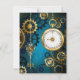 Türkis, strukturiert, Steampunkhintergrund mit Messing- und Goldgetrieben, Silberschlüssel und Uhr. Steampunkstil.