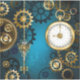 Türkis, strukturiert, Steampunkhintergrund mit Messing- und Goldgetrieben, Silberschlüssel und Uhr. Steampunkstil.